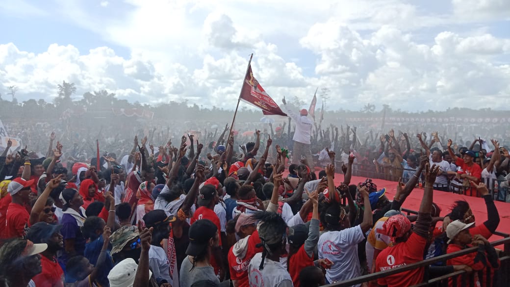 Hal itu dikemukakan oleh lautan massa pendukung paslon nomor urut 1 saat orasi politik dua tokoh pemuda Amungme dan Kamoro, yakni Rafael Takereau dan Elfinus Omaleng pada kampanye akbar JOEL, di Lapangan Aermodeling SP5, Timika pada Sabtu (23/11/2024).