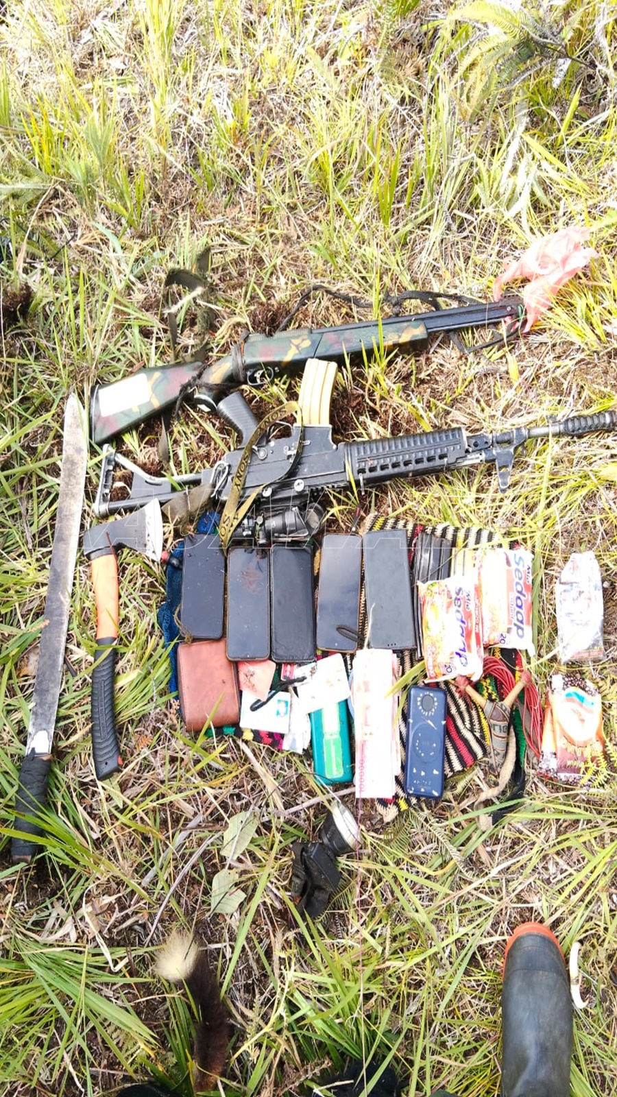 Kemudian ada juga senjata tajam berupa kapan dan parang. Lalu ada juga katapel, korek api, 1 buah KTP atasnama Meni Wakerwa, Kartu Papua Sehat, dan uang tunai sebesar Rp 3.800 ribu, serta 2 buah noken dan 1 buah tas selempang.