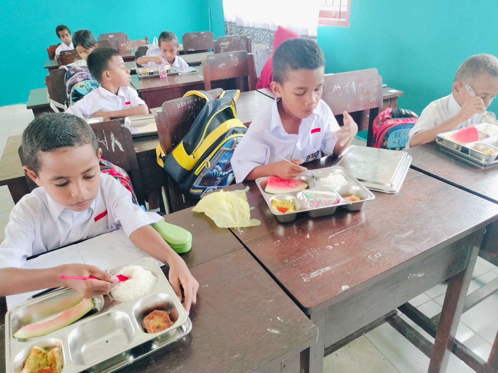 Siswa-siswi SD Inpres Nawaripi menikmati program MBG.