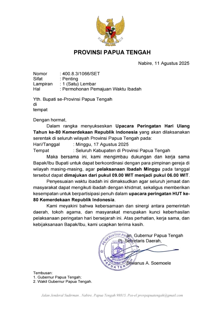 Timika (suaramimika) – Pemerintah Provinsi Papua Tengah, mengimbau agar pelaksanaan ibadah Minggu (17/8/2025) dari pukul 09.00 WIT, menjadi pukul 06.00 WIT.