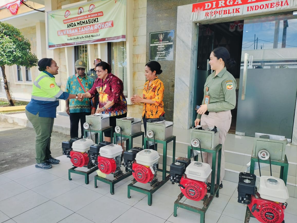 Bantuan mesin parut sagu diterima langsung oleh Kepala Dinas Tanaman Pangan, Hortikultura dan Perkebunan, Alica Irene Wanma dari Jeni Kambuaya selaku perwakilan PT Petrosea, pada Kamis (21/8/2025).