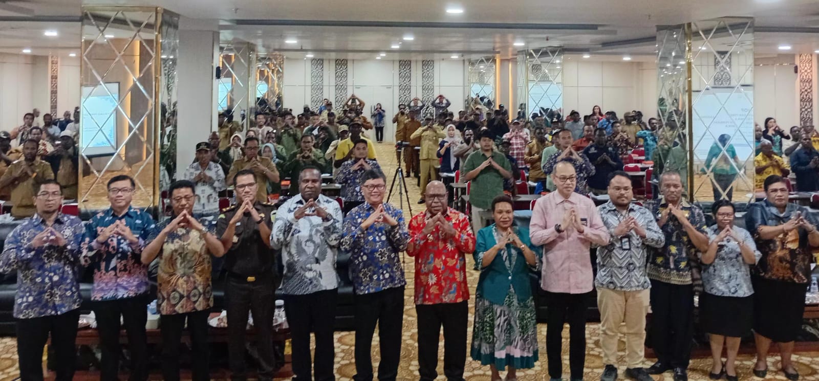 Wakil Bupati Mimika, Emanuel Kemong bersama pihak DPD, DJPb, Kejaksaan Negeri, BKPK, para kepala distrik, kepala kampung aparat Bamuskam usai pembukaan workshop.
