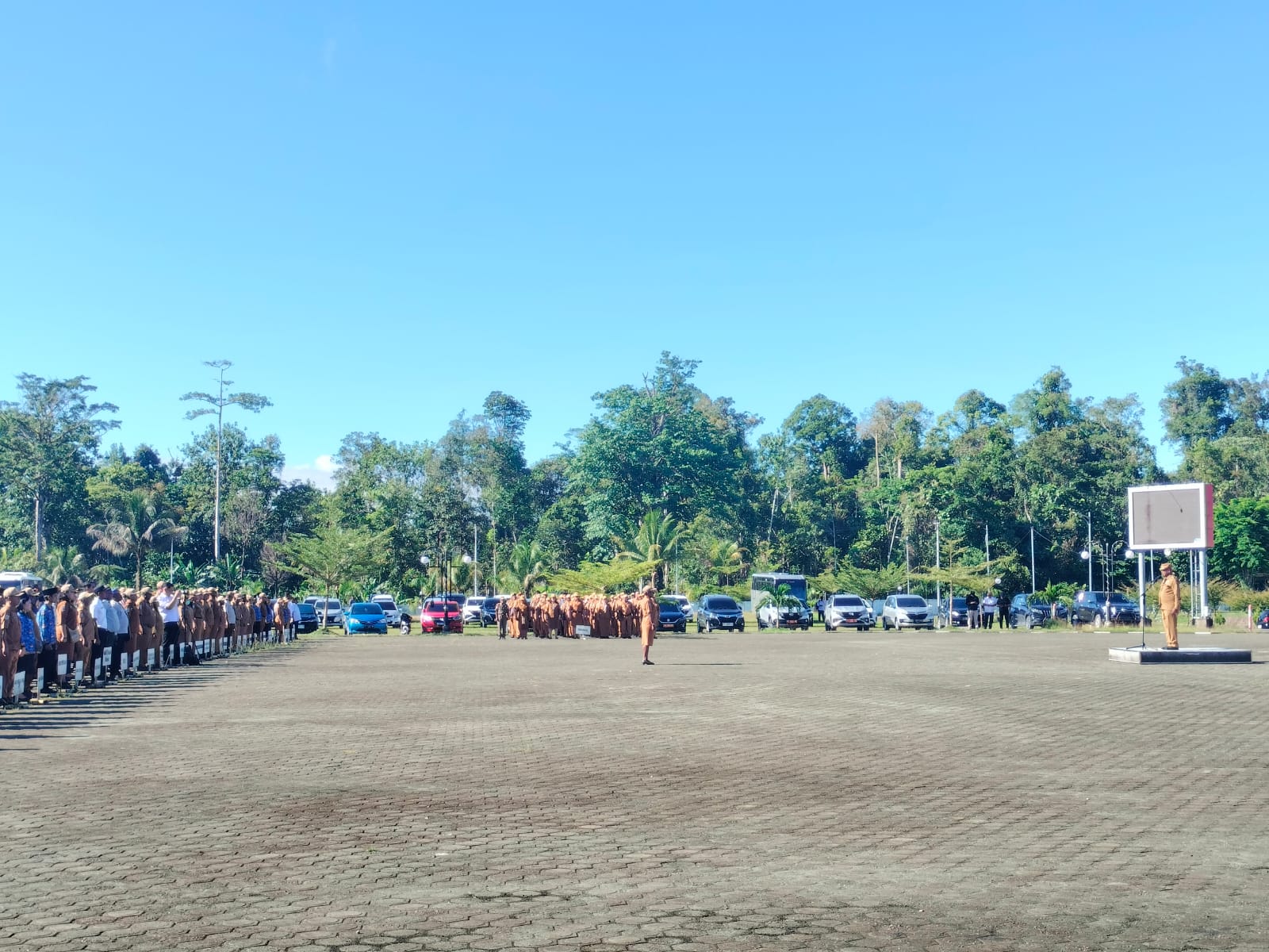 Bupati Mimika, Johannes Rettob saat memimpin apel gabungan di kantor Pusat Pemerintahan pada Senin (29/9/2025).