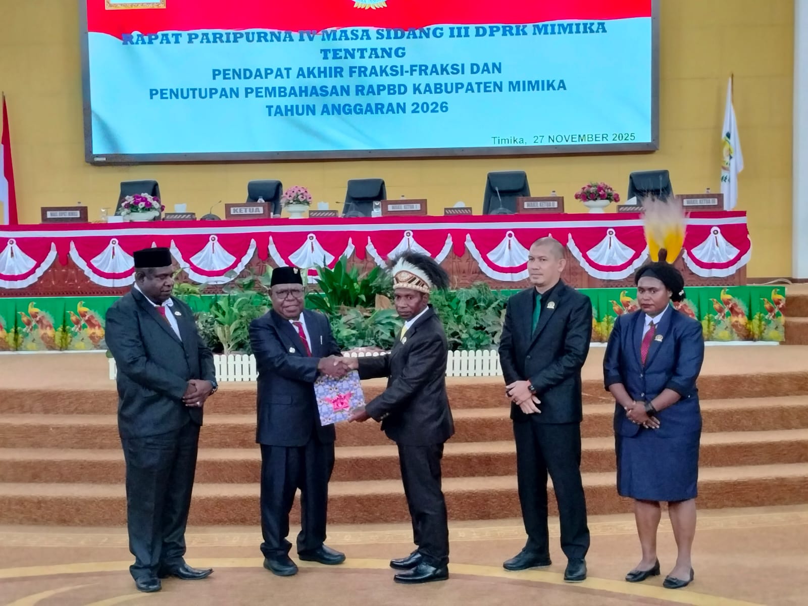 Timika (suaramimika.com) – Delapan Fraksi DPRK Mimika menyetujui Rancangan Anggaran Pendapatan Belanja Daerah (RAPBD) menjadi APBD Tahun 2026, dalam rapat Paripurna IV Masa Sidang III DPRK Mimika tentang pendapat akhir fraksi dan penutupan pembahasan RAPDB Mimika Tahun Anggaran 2026, Kamis (27/11/2025) di ruang Paripurna DPRK Mimika.