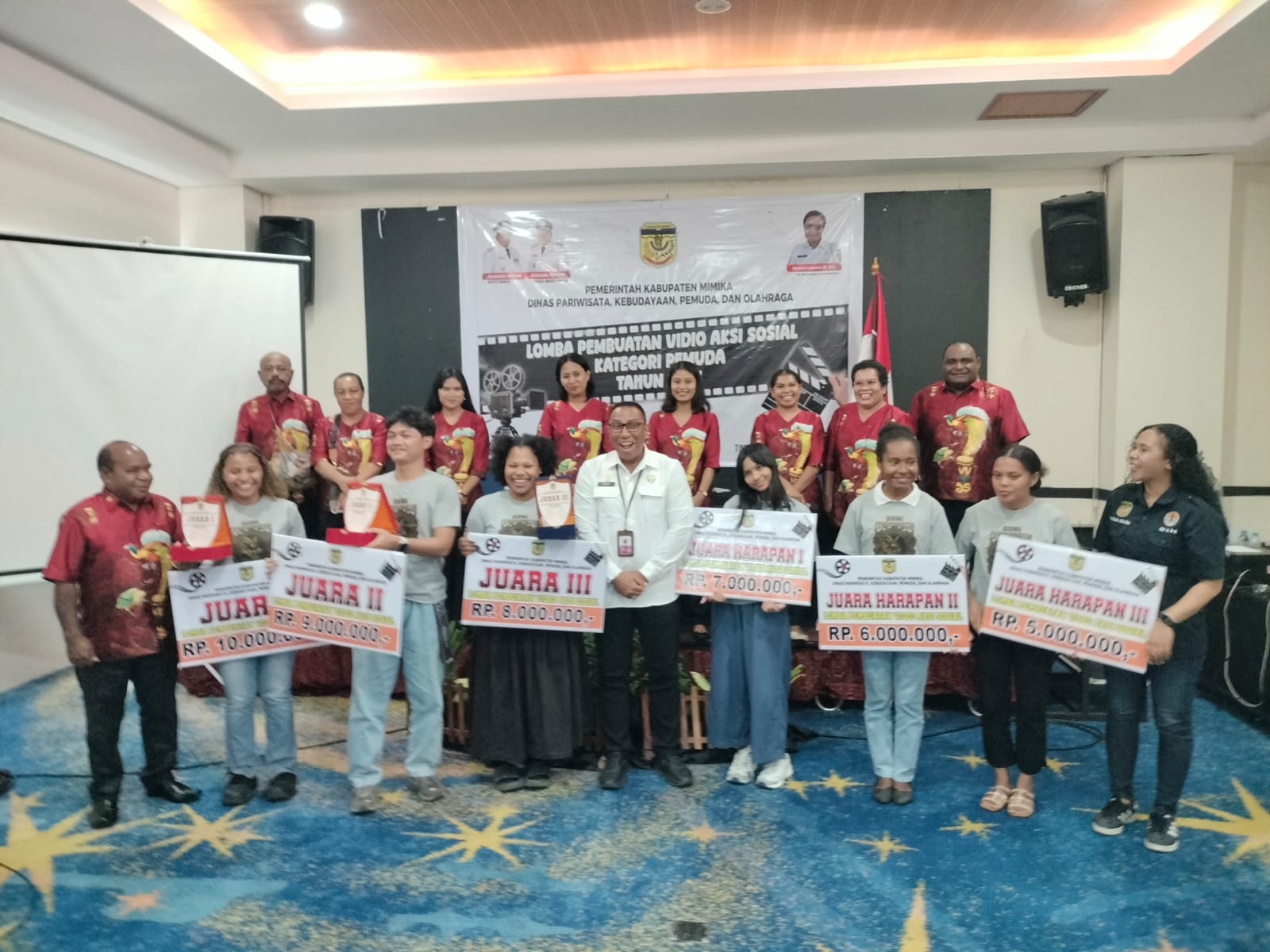 Timika (suaramimika.com) – Dinas Pariwisata, Kebudayaan, Pemuda dan Olahraga (Disparbudpora) Mimika menyerahkan plakat penghargaan dan uang pembinaan kepada enam pemuda berbakat yang telah berhasil menjuarai lomba pembuatan video aksi sosial kategori pemuda.