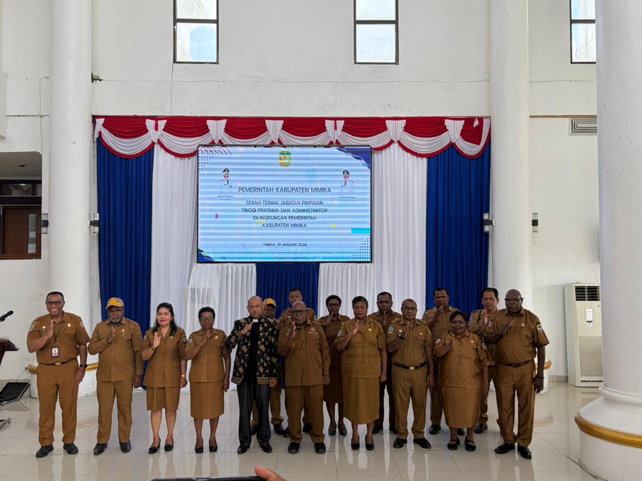 Timika (suaramimika.com) – Pasca dilantik dan dikukuhkan oleh Bupati Mimika, Johannes Rettob pada Kamis (15/1/2026), maka sejumlah Pimpinan Tinggi Pratama dan Administrator mengikuti agenda Serah Terima Jabatan (Sertijab), pada Senin (19/1/2025) di lobi gedung A kantor Pusat Pemerintahan.