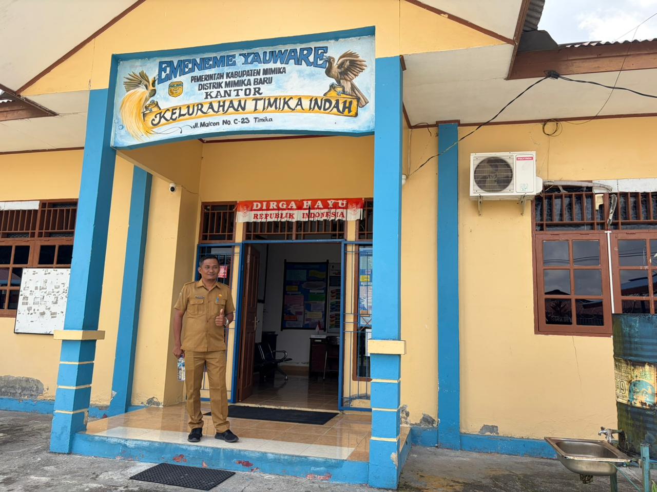 Lurah Timika Indah, Ferdi Mariangga di depan kantor.